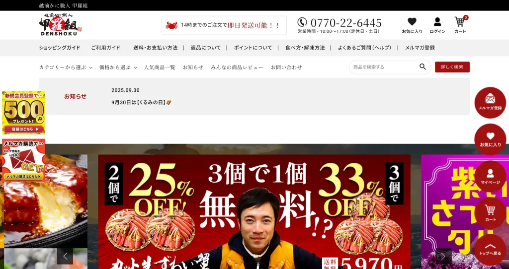 「越前かに職人甲羅組」は、特に楽天市場で絶大な人気を誇る通販サイトです。「楽天ショップ・オブ・ザ・イヤー」を受賞した実績もあり、Eコマースでの販売戦略に長けています 。
