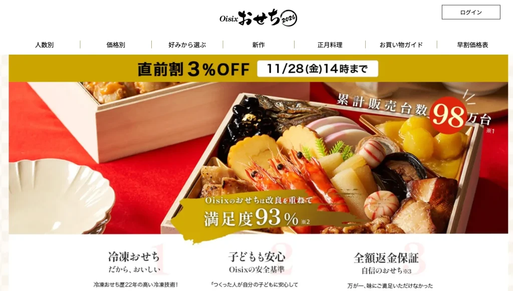 「食の安全」を何よりも優先したいご家庭や、通販おせちにまだ不安が残る方には、Oisixが最適です。手厚い保証と、子どもから大人まで食べやすい優しい味付けは大きな魅力。
